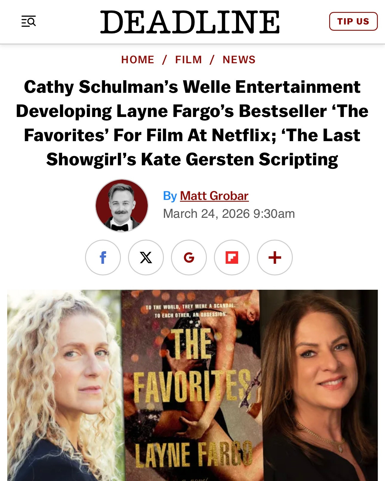 I’m thrilled to announce that The Favorites has been optioned by Welle Entertainment and Netflix for development as a feature, and they’ve hired an absolutely stellar screenwriter: Kate Gersten, who also wrote The Last Showgirl starring Pamela Anderson. She’s going to bring the perfect mix of glam and grit to the adaptation, and I can’t wait to see how she translates my hot mess ice dancers to the screen.
